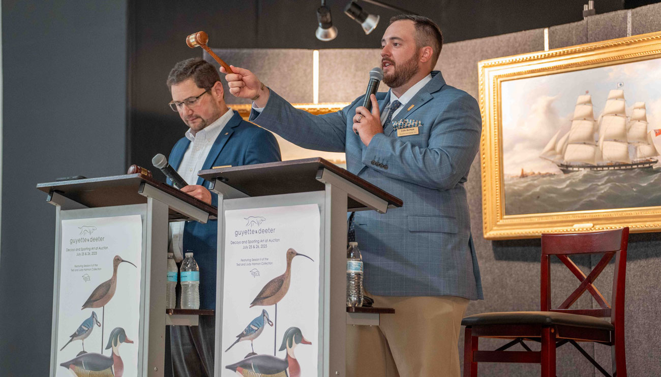 Guyette & Deeter is the largest and most trusted auction company specializing in the marketing and sale of antique waterfowl decoys, decorative bird carvings, sporting and American fine art, fine sporting arms, and American folk sculpture. The firm has earned worldwide recognition for its expertise in these specialized markets.